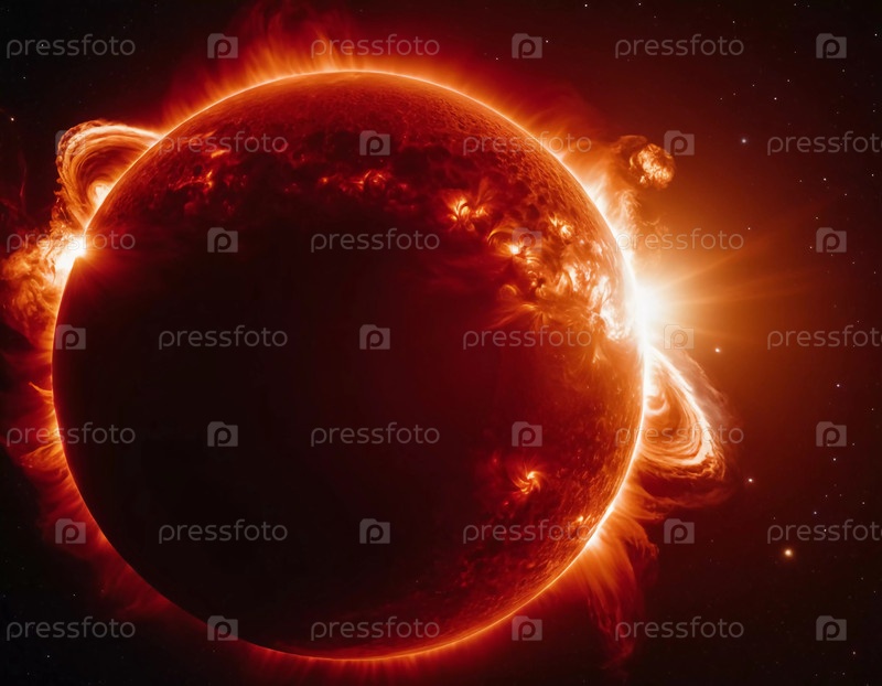 Потрясающий всплеск света окружает далекую планету, выделяя огненные солнечные вспышки и темную поверхность против обширного космоса, создавая потусторонний дисплей
