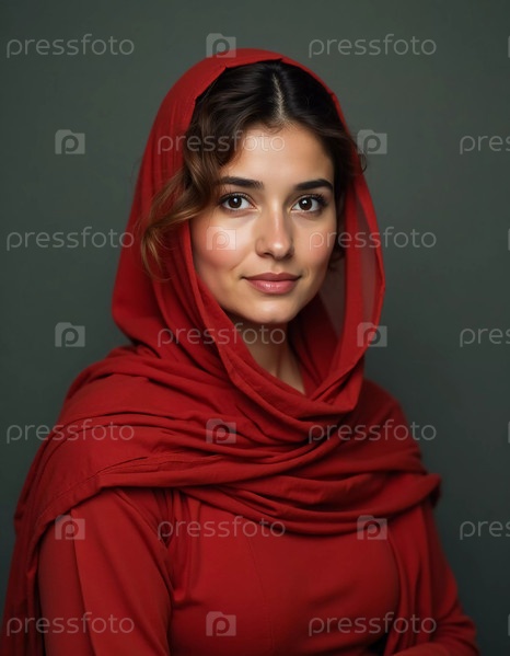 Молодая йеменка носит яркий красный шарф и платье, источающее элегантность. Ее мягкое выражение отражает доверие и культурное наследие, на фоне приглушенного фона
