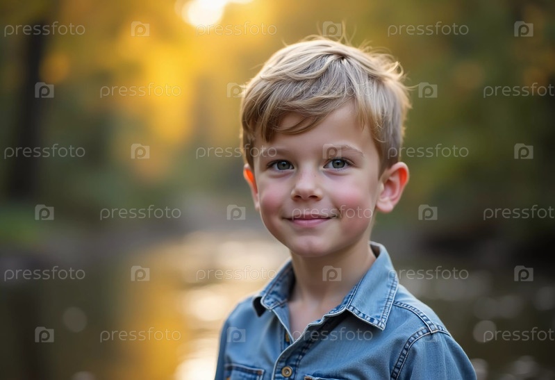 С яркой улыбкой молодой шведский мальчик стоит у безмятежного ручья, где золотистый солнечный свет фильтрует деревья, воплощая беззаботный дух детства в объятиях природы