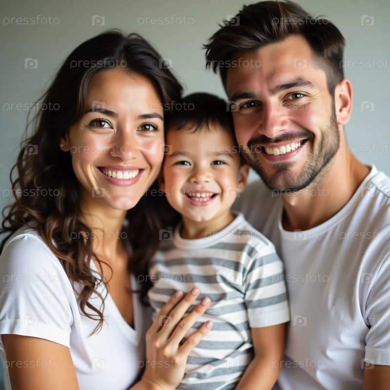В теплой и приглашающей атмосфере счастливая семья позирует близко, источая любовь и смех. Ребенок сияет от радости, окруженный лаской обоих родителей