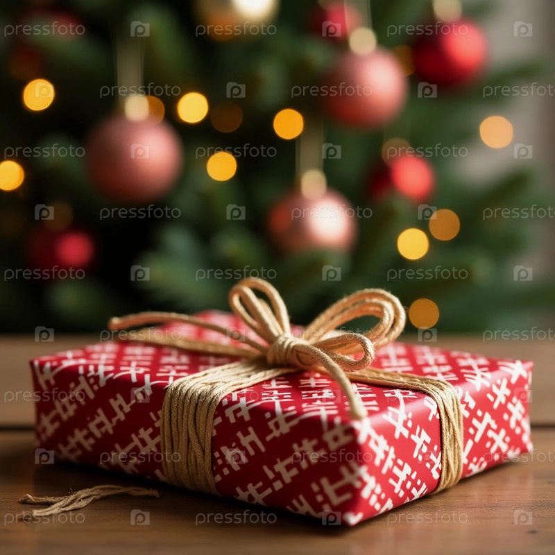 Любовно упакованный подарок сидит на деревянном столе, украшенном веселой красной бумагой и двойником Generative AI