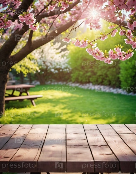 Деревянный стол сидит перед размытым фоном весеннего сада. Розовые цветы сакуры на ветке достигают солнца, которое светит сквозь листву. Копирование пространства для демонстрации продукции. ИИ