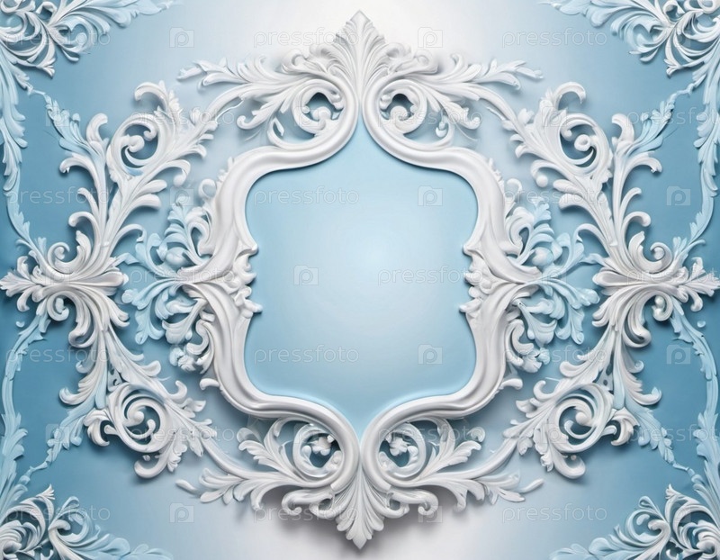 Каркас с белыми декоративными листьями и цветами в стиле рококо-барокко. Нежные мягкие элементы пастельного светло-голубого фона. Сложные детали листьев, нежная красота. Копируйте пространство. генерируемый