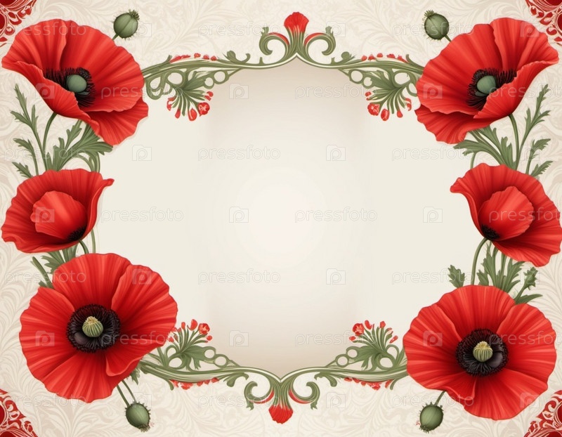 Красные маки с зелеными листьями и стеблями. Маки изображены на различных стадиях цветения, некоторые полностью открыты, а другие в зародыше. Мягкая спина, создающая деликатное и романтическое чувство
