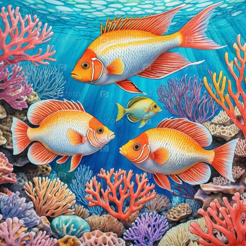 Яркие оранжево-бело-желто-красные рифовые рыбы плавают через коралловый риф. Солнечные лучи пронзают морскую воду. Разнообразие животных. Гидросфера экологии. Антропогенный фактор, влияющий на гибель коралловых рифов. ИИ