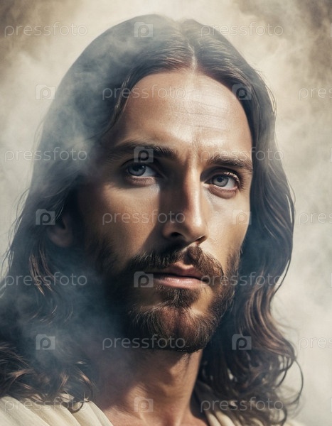Портрет мужчины, одетого как Иисус. Белый халат. Длинные каштановые волосы и борода. Человеку, по-видимому, около 30 лет, и у него серьезное выражение лица. Христианская религия и вера. ИИ