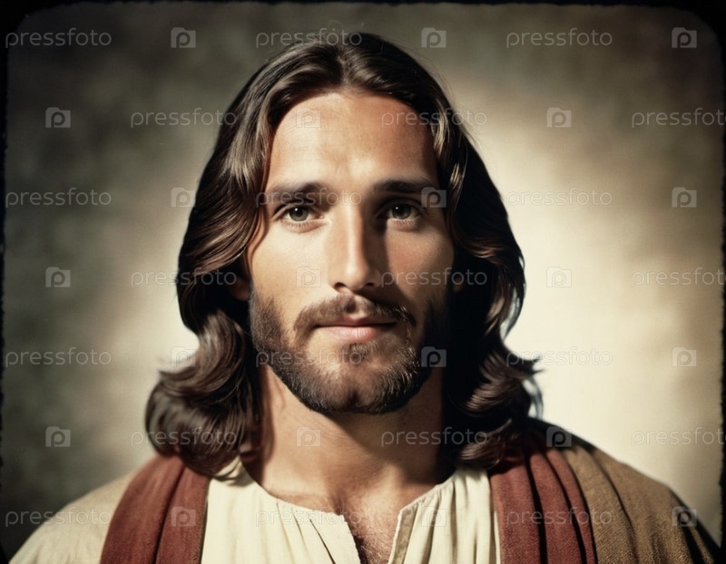 Портрет мужчины, одетого как Иисус. Белый халат. Длинные каштановые волосы и борода. Человеку, по-видимому, около 30 лет, и у него серьезное выражение лица. Христианская религия и вера. генерируемый