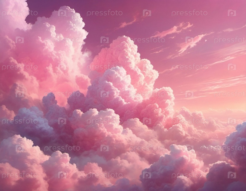 Прекрасный вид на розовые облака в ярком закате неба. Облака пушистые и полны света, создавая потрясающий визуальный дисплей. Драматические нереальные небеса с кучевыми и стратовыми облаками в атмосфере. Искусство
