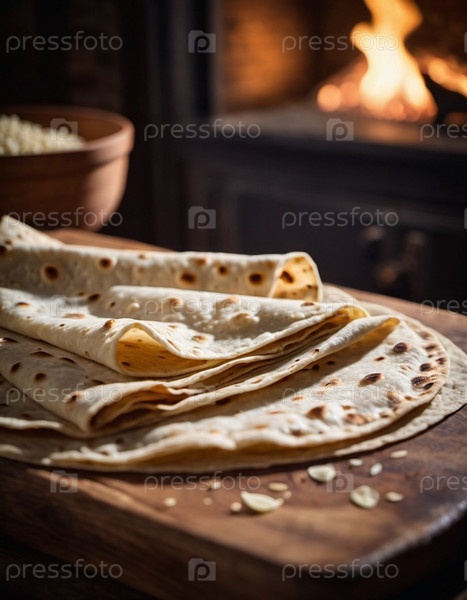 Свежеиспеченный лаваш элегантно опирается на деревенскую деревянную доску, демонстрируя ее мягкую текстуру и золотисто-коричневые пятна. Теплый огонь трещит в очаге, бросая уютное свечение над сценой. Искусственный лепесток
