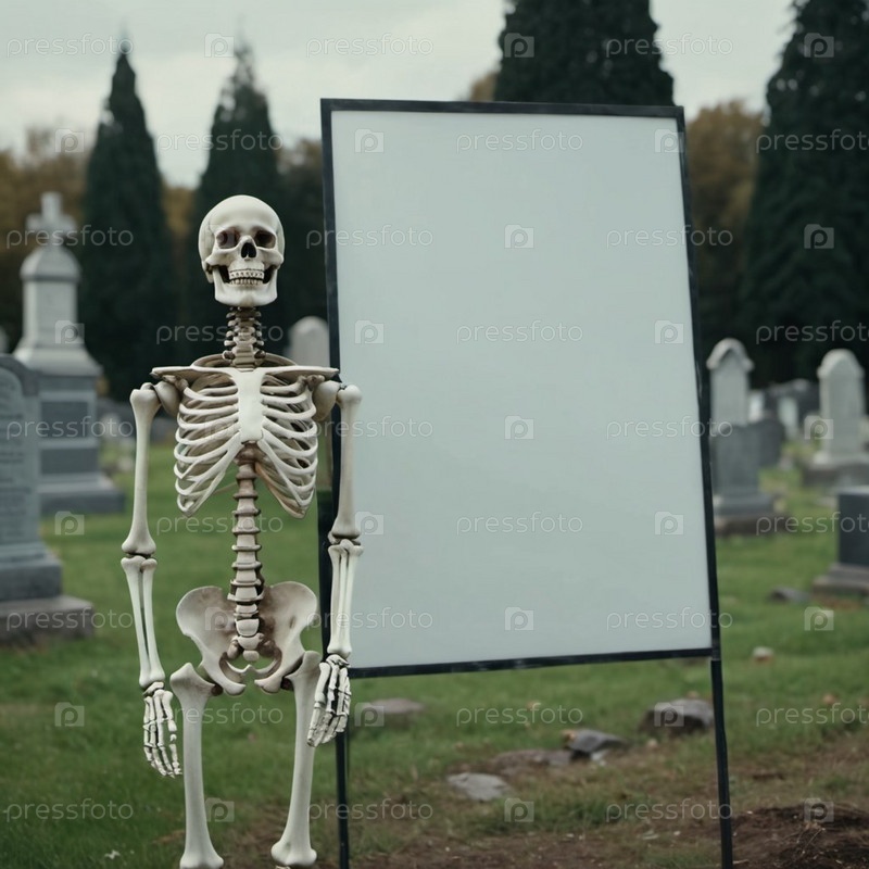 Фигура скелета стоит, держа белый плакат. Костящиеся руки скелета предлагают достаточно места для любого сообщения или дизайна. Скелет что-то предлагает. Тема Хэллоуина. генерируемый