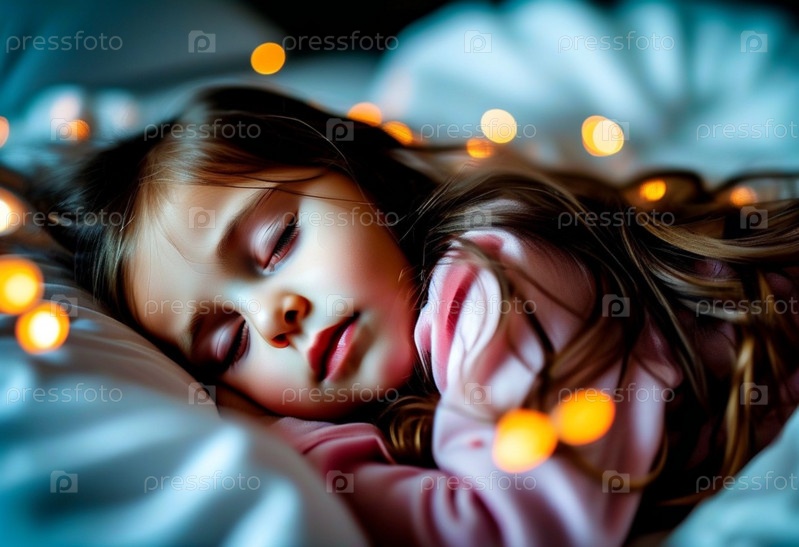 Молодая девушка с длинными ресницами мирно спит в своей уютной кровати, окруженной мягкими светящимися огнями во время спокойного вечера. Кровать освещается теплыми мягкими огнями, которые создают чарующую атмосферу. ИИ