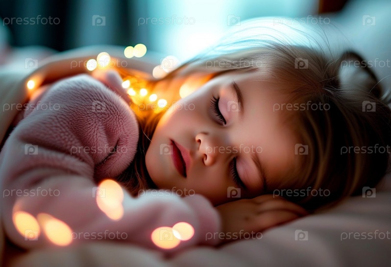 Молодая девушка с длинными ресницами мирно спит в своей уютной кровати, окруженной мягкими светящимися огнями во время спокойного вечера. Кровать освещается теплыми мягкими огнями, которые создают чарующую атмосферу. ИИ