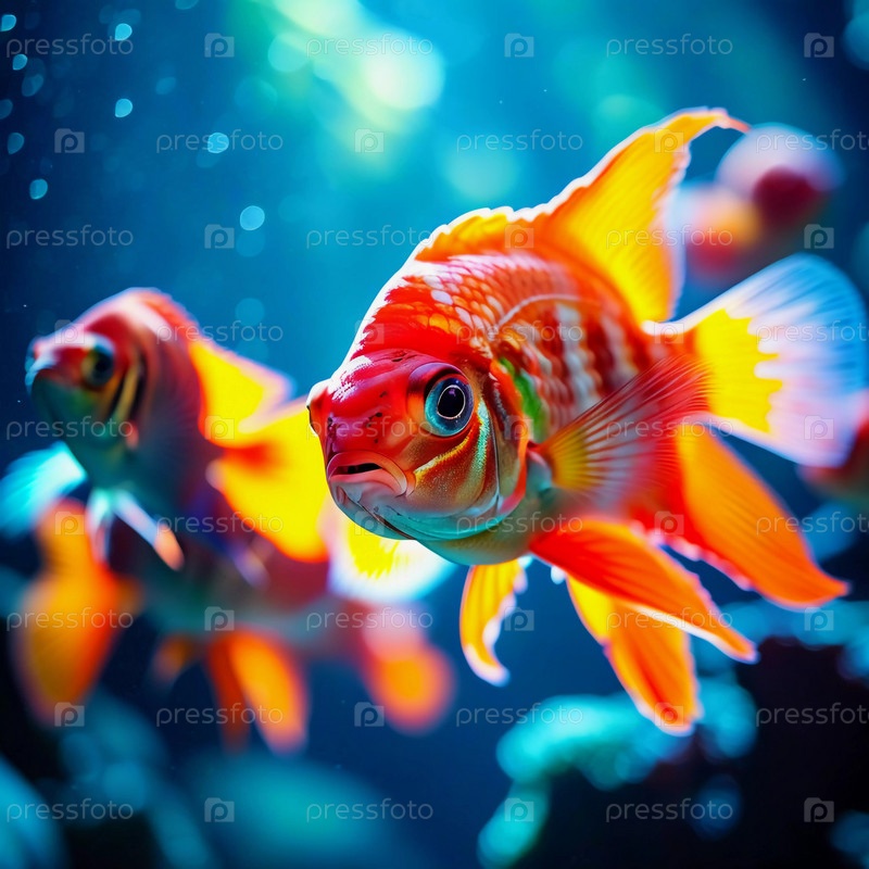 Яркие оранжево-желто-красные рифовые рыбы плавают в морской океанской воде. Солнечные лучи. Разнообразие животных. Гидросфера экологии. Красочные рыбы плавают изящно в хорошо освещенном аквариуме. Аквариумы как хобби. ИИ