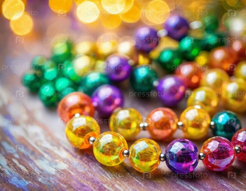 Красочные бусины в фиолетовом, зеленом и золотом создают праздничную атмосферу, когда они лежат на мерцающем фоне боке, воплощая радостный дух праздников Марди Гра в Новом Орлеане