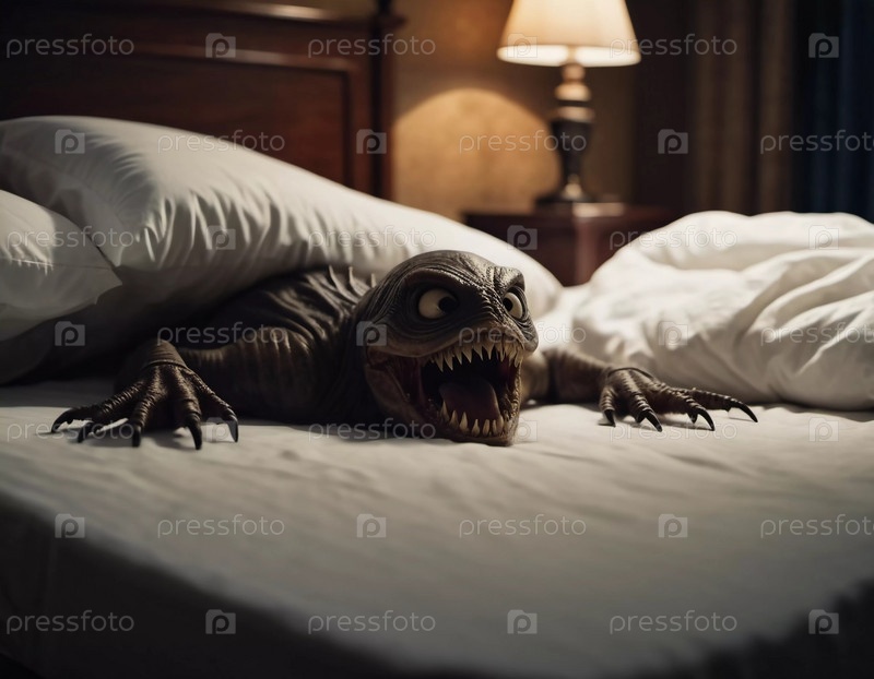 Ужасающее кошмарное существо, скрывающееся под кроватью в тускло освещенной спальне, захватывает сущность страха и неизвестности ночью. Гротескное существо с привидениями тихо появляется из-под кровати. ИИ