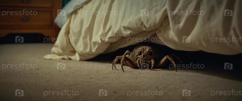 Ужасающее кошмарное существо, скрывающееся под кроватью в тускло освещенной спальне, захватывает сущность страха и неизвестности ночью. Гротескное существо с привидениями тихо появляется из-под кровати. ИИ