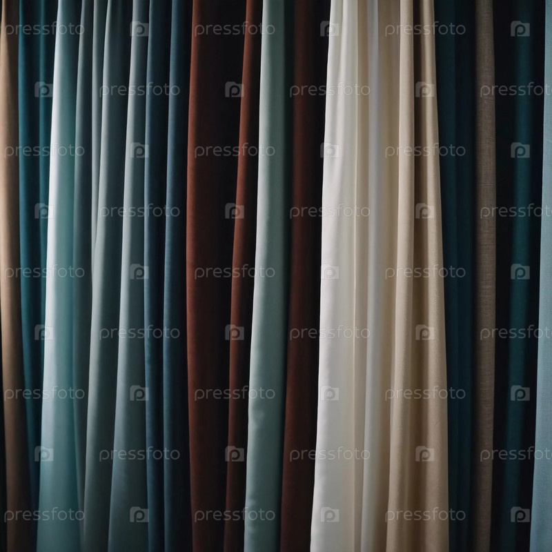 Коллекция штор изящно драпируется, демонстрируя смесь богатых цветов и текстур. Тканевые панели ловят мягкий дневной свет, улучшая приглашающую атмосферу комнаты. Генерирующий ИИ