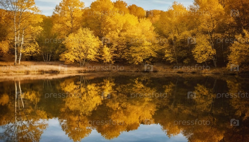 Яркие желтые листья создают потрясающий осенний дисплей вокруг спокойного озера, с отражениями, отражающими листву на поверхности воды, когда день подходит к концу. Генерирующий ИИ