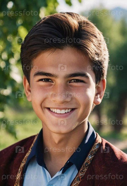 Радостный симпатичный таджикский мальчик 18 лет сияет от счастья, стоя в живописном пейзаже, окруженном красотой природы во время теплого, золотого часового света. Счастливый улыбающийся брюнет. генерируемый