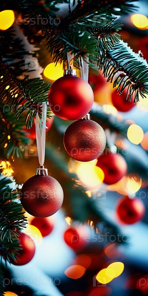 Красочные рождественские украшения украшают ветви елки, яркие шары в оттенках красного и розового, олицетворяющие праздничное настроение зимой. С Новым годом искусство боке фон. Генеративный ИИ