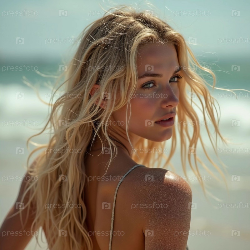 Блондинка в купальнике смотрит назад, стоя у береговой линии. Нежные морские волны лазают у ее ног под ясным голубым небом. Длинные волосы, красивое молодое лицо. Реклама путешествий и одежды. ИИ