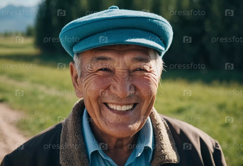 Пожилой мужчина в светлой куртке и синей рубашке ярко улыбается, демонстрируя счастье и удовлетворенность в естественной обстановке на открытом воздухе в течение дня. Житель Казахстана. генерируемый