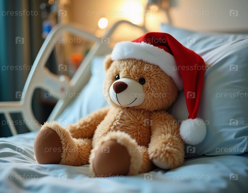Плюшевый медведь, одетый в шляпу Санты, сидит на больничной койке, предлагая общение ребенку. Мягкая игрушка приносит тепло и радость в сложной обстановке. Генерирующий ИИ