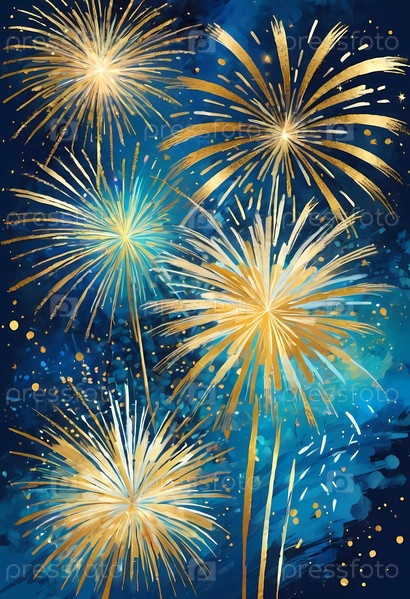 Красочные фейерверки освещают ночное небо, когда люди празднуют Новый год. Вспышки золота и синего цвета вызывают радость и волнение, отмечая новый старт. Фейерверки взрываются на темном небе. Генеративный ИИ