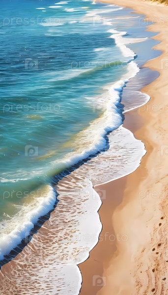 Потрясающий летний фон имеет берег мягкого песчаного пляжа рядом с ярким синим морем. Солнечный свет блестит на поверхности воды, создавая безмятежную атмосферу. Нарисованная картина. Генерирующий ИИ