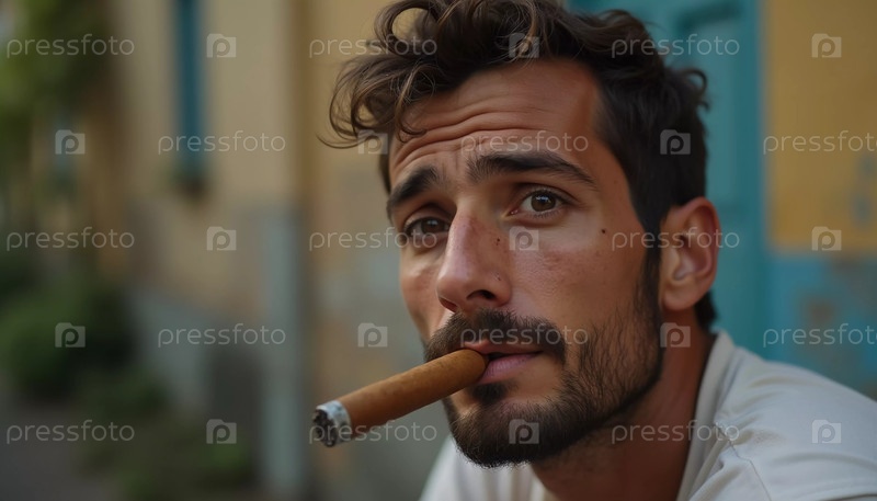 Молодой человек с Кубы уверенно курит сигару, олицетворяющую богатое культурное наследие региона. Его расслабленное выражение отражает непринужденный образ жизни, типичный для этого района. Генерирующий ИИ