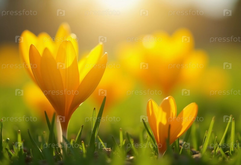Нежный желтый цвет крокуса цветет в пышной зеленой траве, солнечный свет в спокойной весенней обстановке. Возрождение природы. Шафран Крокус является родом многолетних луковичных травных растений семейства Iris Iridaceae