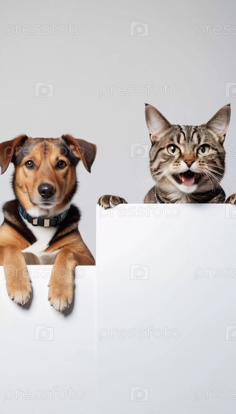 Любопытная собака и кошка заглядывают на белую поверхность с выражением удивления и игривости. Собака и кошка расположены бок о бок, каждый смотрит на белую поверхность. Ветеринарная наука. ИИ