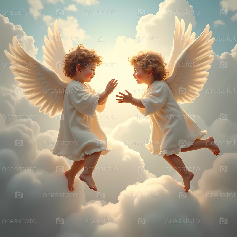Двое маленьких детей с вьющимися волосами и ангельскими крыльями играют вместе в облаках, освещенных мягким светом, который создает безмятежную и радостную атмосферу. Генеративный ИИ