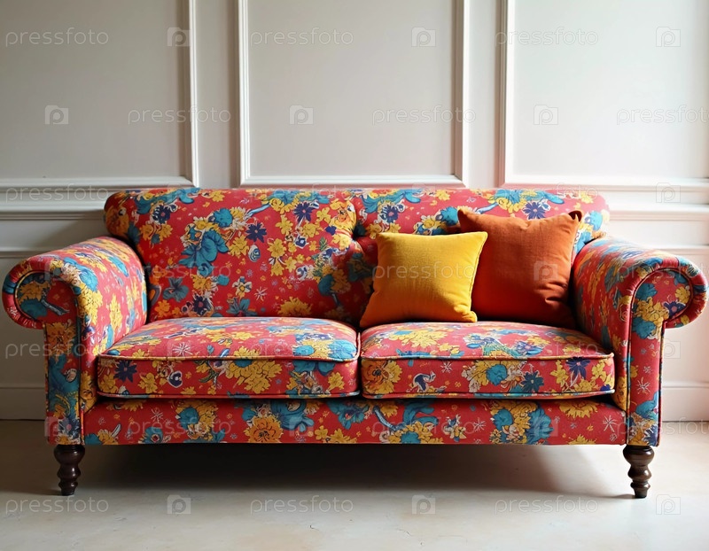 Гостиная вспыхивает цветом, поскольку ярко-красный цветочный диван занимает центральное место, дополненное мягкими подушками в теплых оттенках, приглашая к расслаблению и творчеству в пространстве