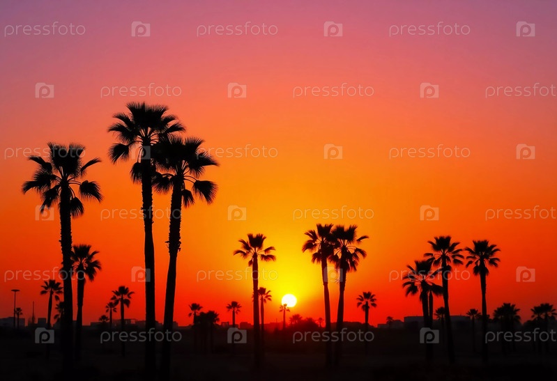 Когда солнце опускается на горизонт, пальмы стоят высоко в силуэте на фоне потрясающего неба, заполненного яркими оттенками апельсина и фиолетового, создавая спокойную тропическую атмосферу