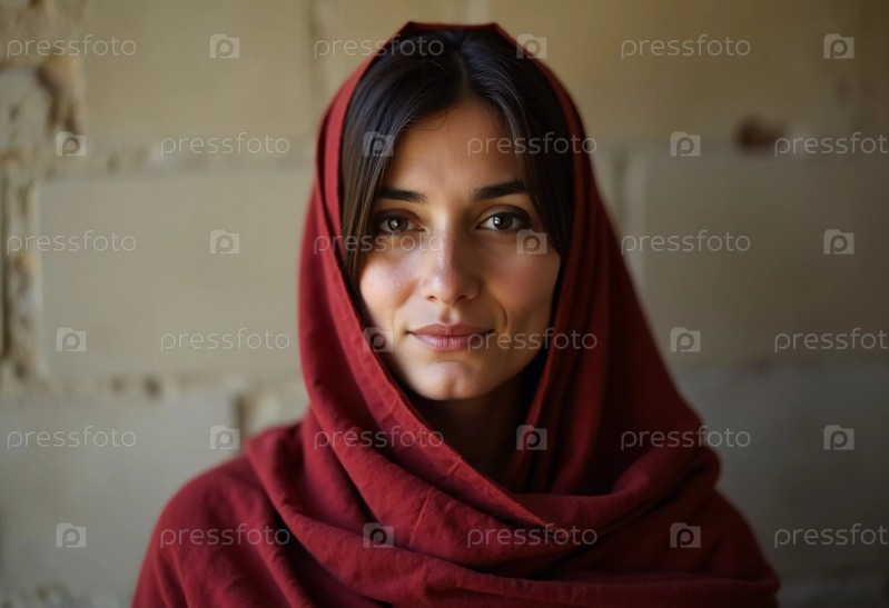 В теплой, освещенной солнцем обстановке молодая йеменская женщина стоит элегантно, завернутая в яркий красный шарф, который дополняет ее безмятежное выражение, создавая поразительную визуальную гармонию