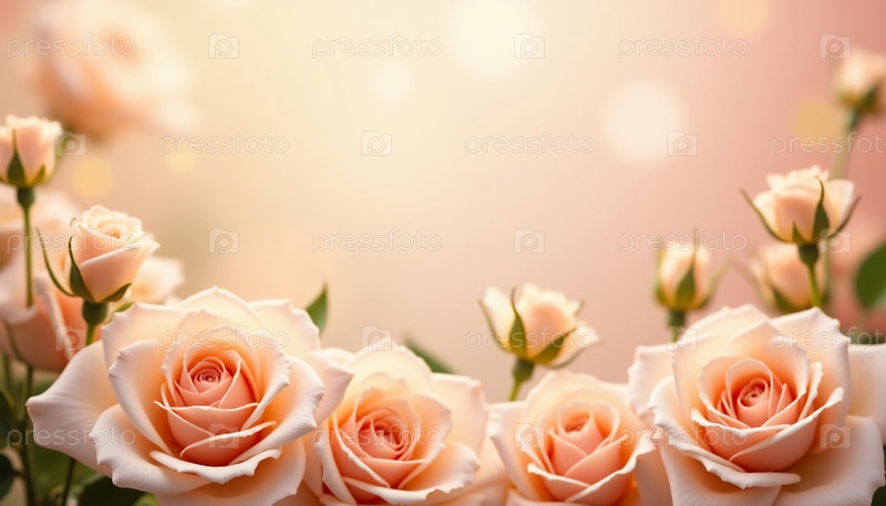 Нежное расположение бежевых и розовых роз заполняет передний план, их мягкие листья излучают тепло и обаяние.Фон украшен очаровательным эффектом боке Generative AI