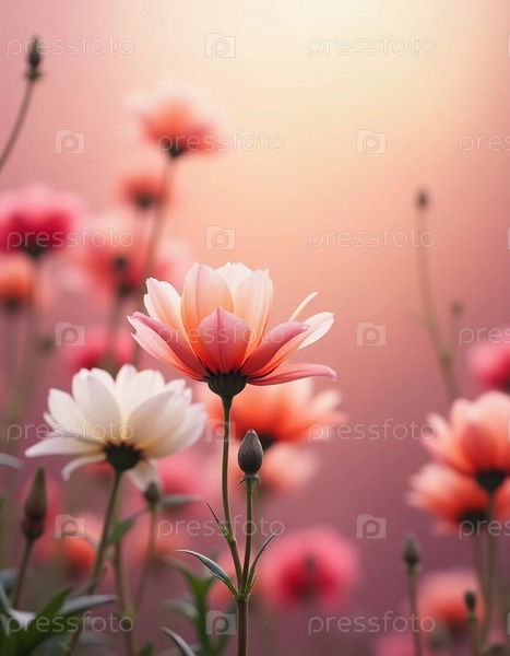 Нежные цветы в оттенках розового и белого изящно поднимаются, их размытый фон усиливает мечтательную атмосферу солнечного дня весной