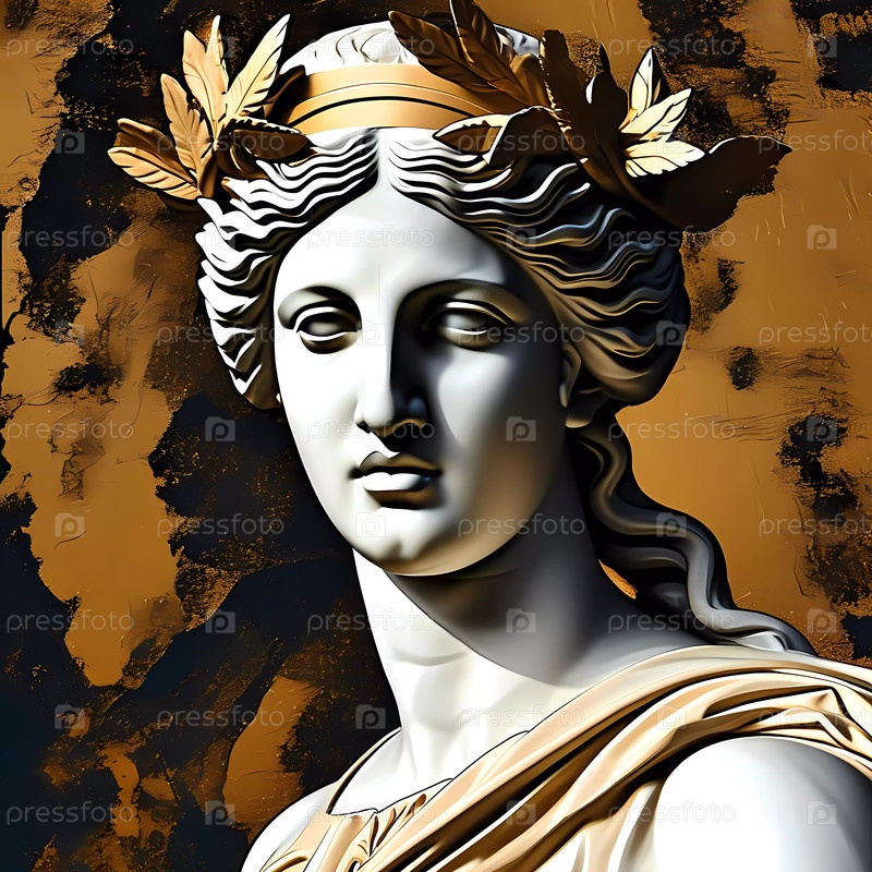 Потрясающее изображение богини Афродиты, украшенное венцом из листьев и безмятежным выражением. Богатый золотой фон усиливает ее божественную красоту и элегантность