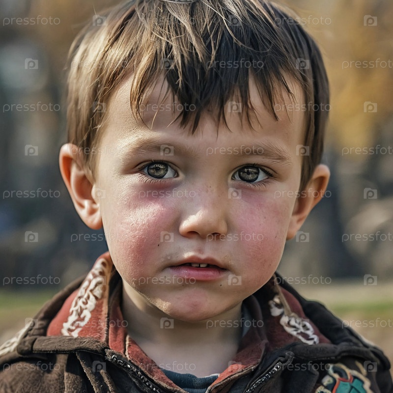 Мальчик стоит на улице, источая любопытство и невинность. Его теплый взгляд вызывает связь, когда осенние листья мягко падают вокруг него, освещая его игривый дух