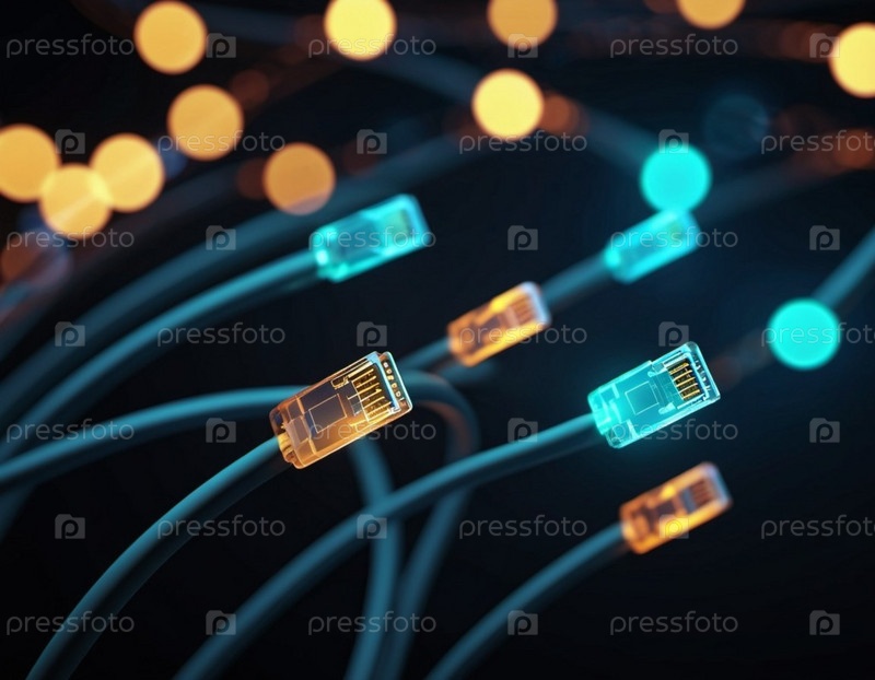 Синие и оранжевые светящиеся провода скручиваются и переплетаются на темном фоне с боке. Черные кабели и разъемы со светящимися огнями и цепями соединяются, чтобы сформировать сеть. генерируемый