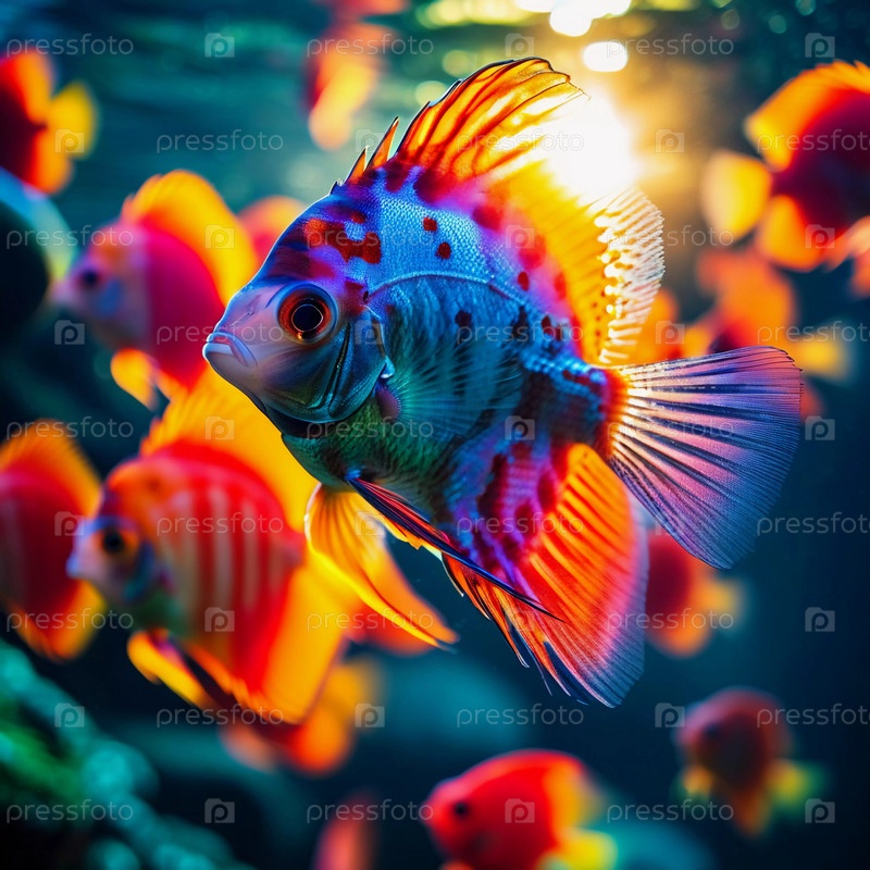 Яркие оранжево-желто-красные рифовые рыбы плавают в морской океанской воде. Солнечные лучи. Разнообразие животных. Гидросфера экологии. Красочные рыбы плавают изящно в хорошо освещенном аквариуме. Аквариумы как хобби. ИИ