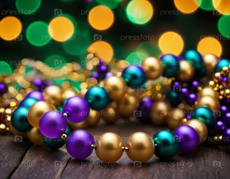 Красочные бусины в фиолетовом, зеленом и золотом создают праздничную атмосферу, когда они лежат на мерцающем фоне боке, воплощая радостный дух праздников Марди Гра в Новом Орлеане
