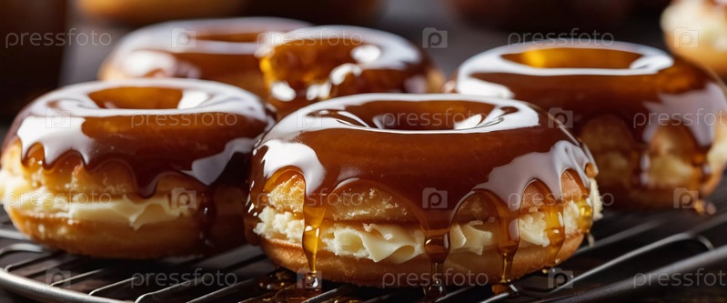 Пачка медовых глазурованных пончиков с глянцевым карамельным покрытием, украшенных хрустящими начинками, приглашая вас побаловать себя сладким угощением. Эти пончики идеально подходят для любого любителя десертов. Генерирующий ИИ