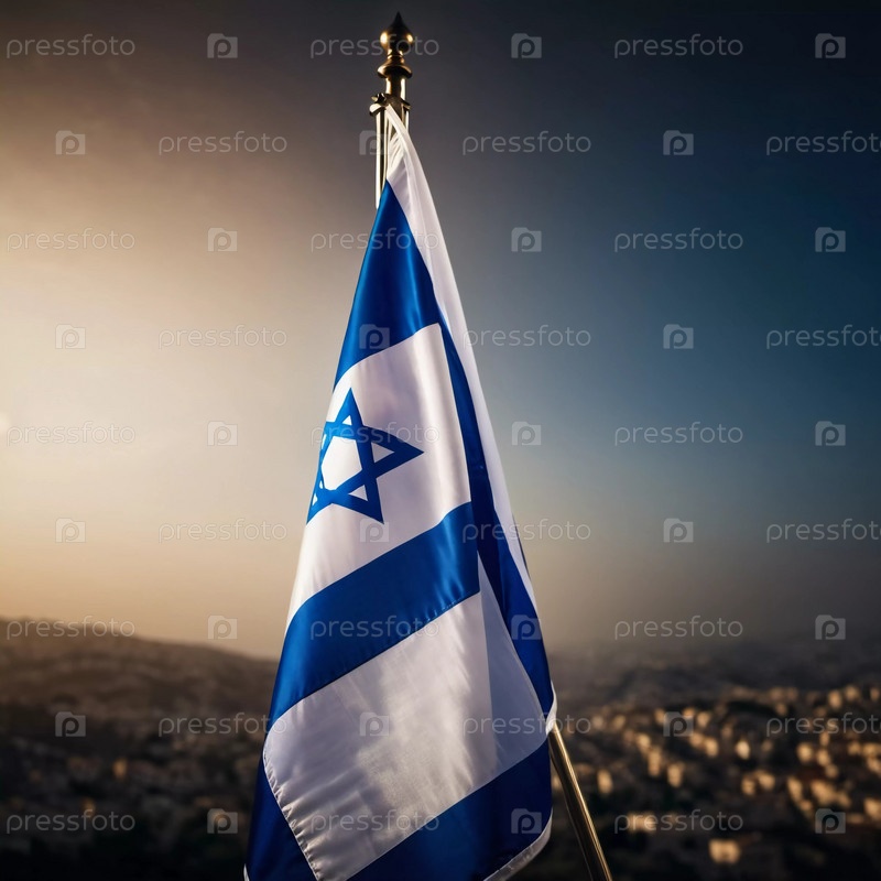 Израильский флаг. Волнуясь на ветру, с синими и белыми полосами и звездой Давида в центре. Чувство движения и энергии. Сгенерированный ИИ