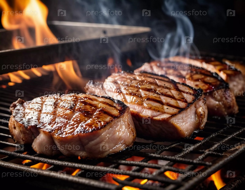 Сочная жареная свинина жарится на открытом огне, создавая вкусный дымчатый аромат и идеальные метки на уютном заднем дворе в течение вечера