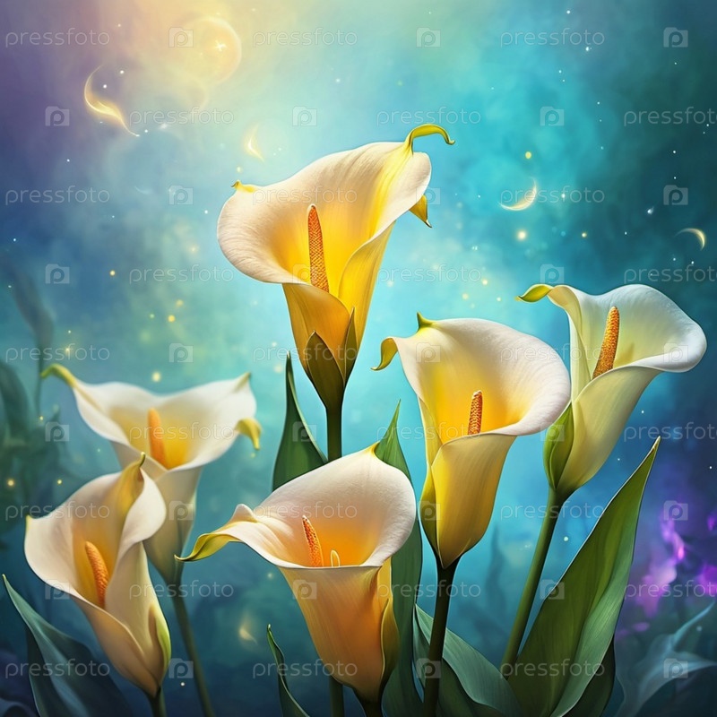 Скопление элегантных лилий каллы появляется на фоне завораживающего красочного неба, демонстрируя их изящные кривые и мягкое свечение в сумеречный час. Генерирующий ИИ