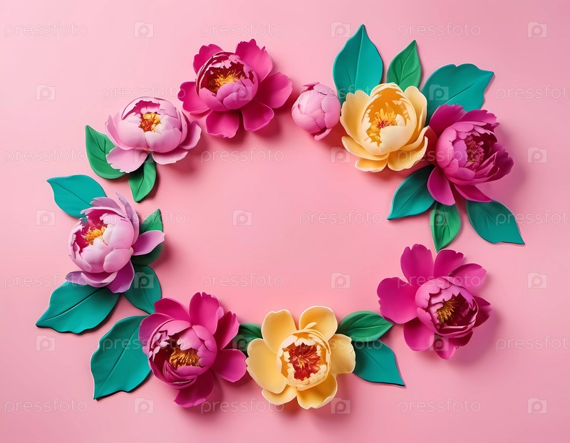 Декоративное расположение имеет красивые пионы и пышные зеленые листья, окружающие пустое розовое пространство. Мягкие цвета предлагают безмятежное, художественное прикосновение, подходящее для различных дизайнерских целей. ИИ