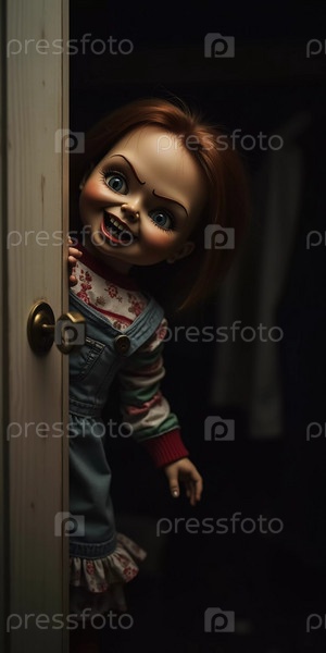 Кукла с пугающими чертами лица выглядывает из шкафа ночью, ее пронзительный взгляд и кривая улыбка создают леденящую атмосферу в тускло освещенной комнате. Страшная кукла для ужаса. Генеративный ИИ