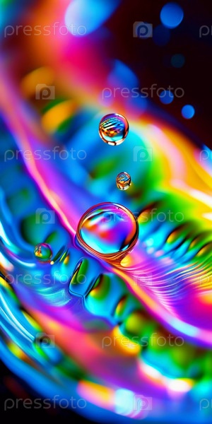 Множество ярких капель лопается в красочном всплеске, создавая потрясающее отображение ярких оттенков на мягко размытом фоне. Замораживание движения. Красота природы в данный момент. ИИ